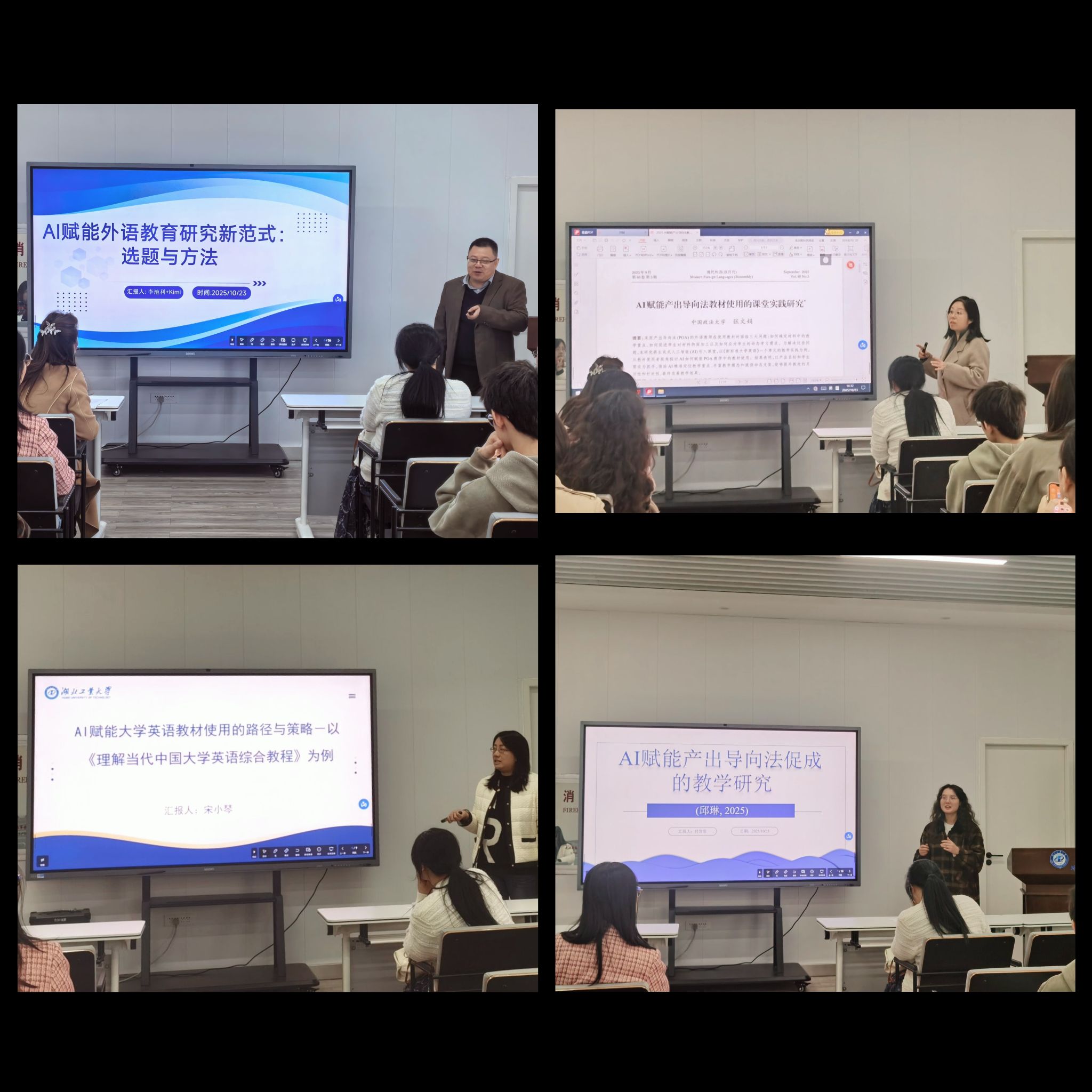 工作坊以“AI赋能外语课堂教学实践与研究”为主题,强调通过实践与研究,推动学术共同体的建设与发展。李池利、陈燕琴、宋小琴、付容容四位老师分别从“AI赋能外语教育研究新范式:选题与方法”,“AI赋能产出导向法教材使用的课堂实践研究”,“AI赋能大学英语教材使用的路径与策略——以《理解当代中国大学英语综合教程》为例”,“ AI赋能产出导向法促成的教学研究”四个方面结合自身的课堂实践经验,深入探讨了AI赋能外语课堂教学的实践路径与研究方向。
