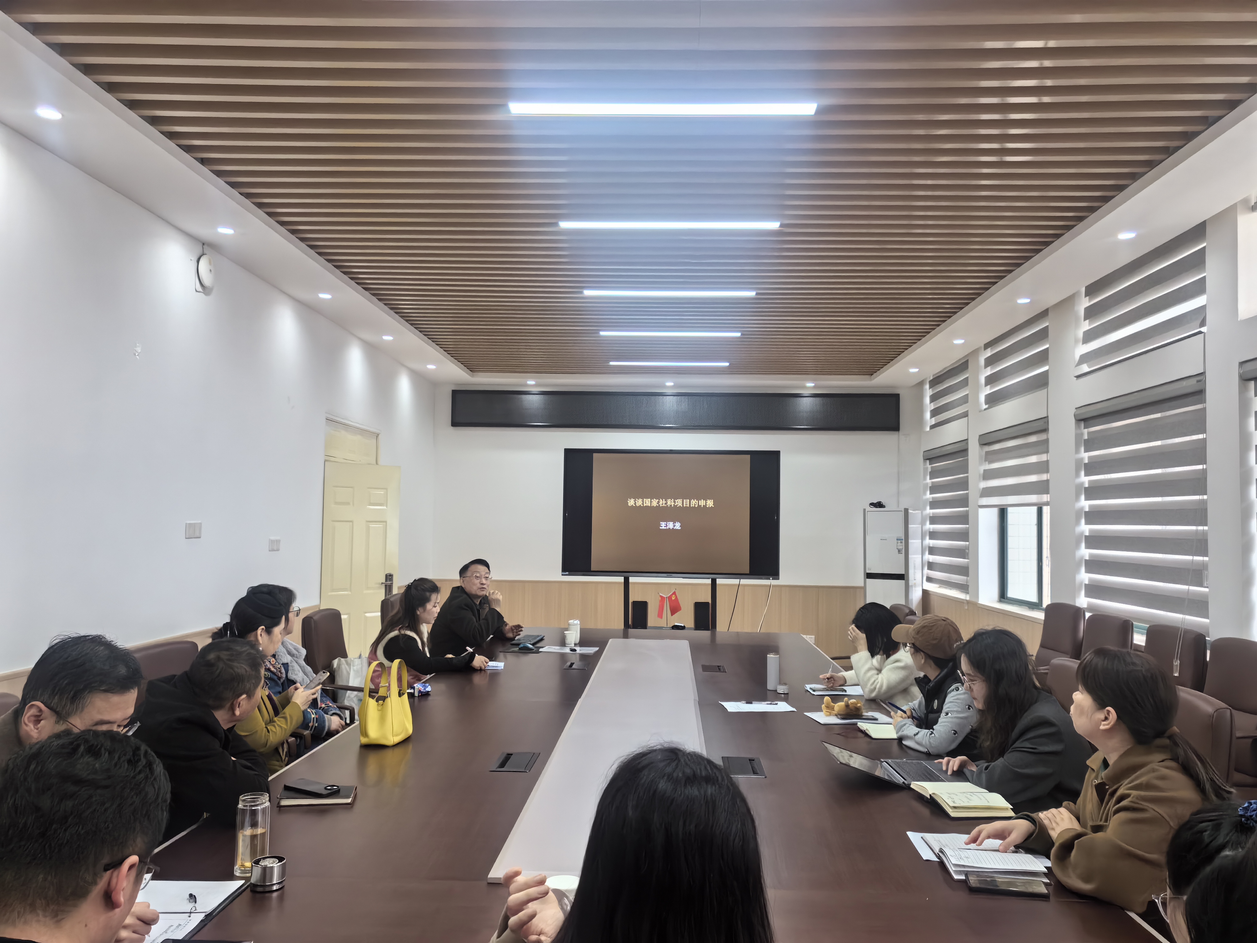 辅导报告结束后,王泽龙教授与2026年拟申报高水平国家基金项目的老师们进行了座谈。他首先对拟申报的项目标题进行了综合点评,然后与每一位申报者进行了一对一的交流,从项目书内容到格式等方面都给出了中肯的修改意见和建议。辅导现场互动热烈,学术氛围浓厚,与会教师一致表示受益匪浅。后续,学院将继续围绕我校社会科学振兴计划纲要,不断推进理论创新与方法创新,稳步提升教师研究能力。