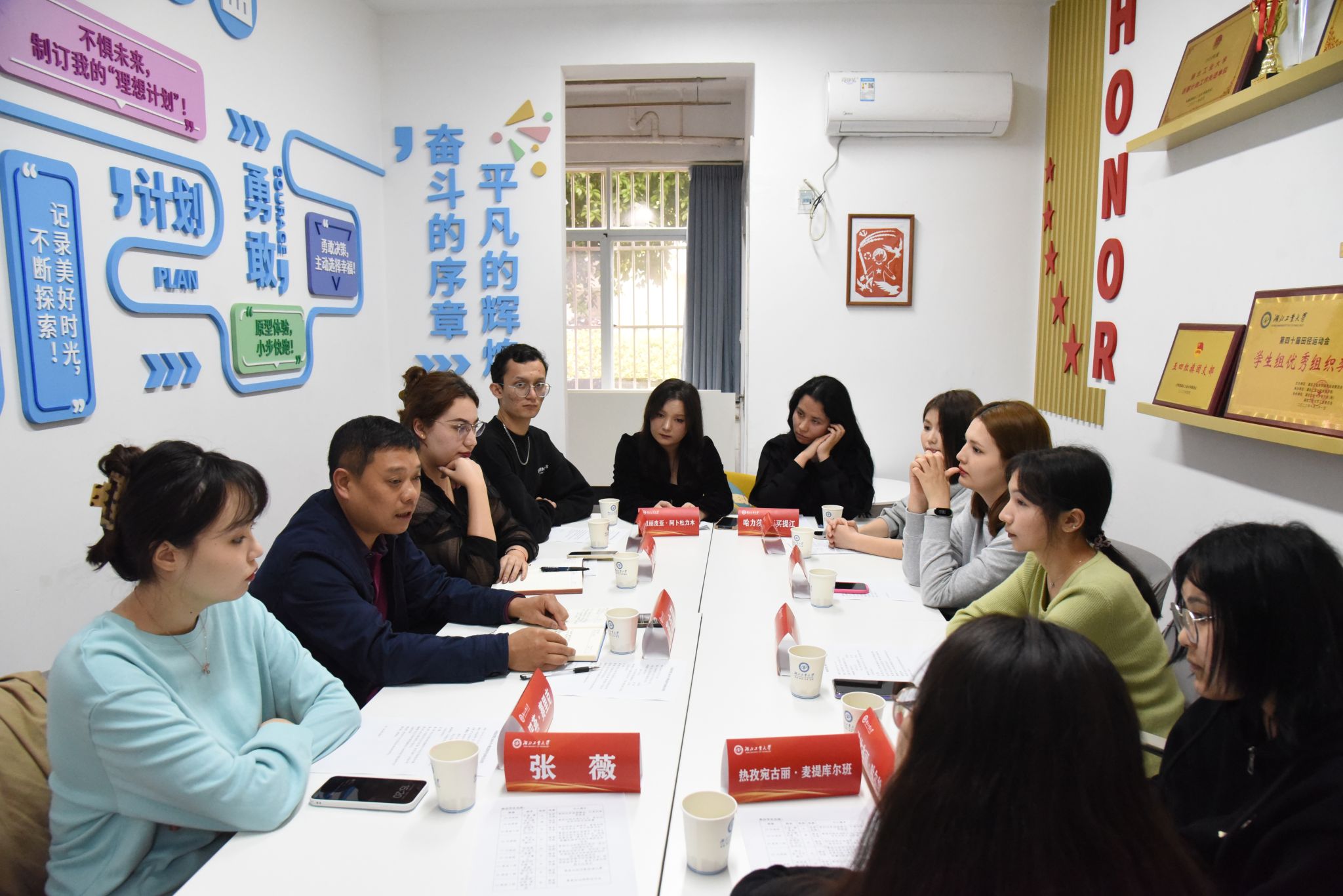 在互动交流环节,参会学生依次分享了在校学习生活方面的情况,并就存在的困难提出了意见、建议。2023级英语班周小岚分享了自己在专业学习方面的收获,她希望学校能提供更多的关于考研和就业的指导,帮助她更好走向职场,服务社会。2022级汉语班爱丽菲娅表示自己已顺利通过了大学英语四级,拿到了普通话证书,并积极参加活力秀、运动会等文体活动,自己也非常关注时政,希望能够提升综合能力,做好职业规划,向着更高的目标不断前行。2022级汉语班吾尔开西谈到自己的职业理想是做一名汉语国际志愿者,通过学校孔子学院载体,实现个人价值,同时为传播中华文化做出贡献。交流中,张志国书记、鲁修红院长不时与同学们互动,现场气氛活跃、融洽。