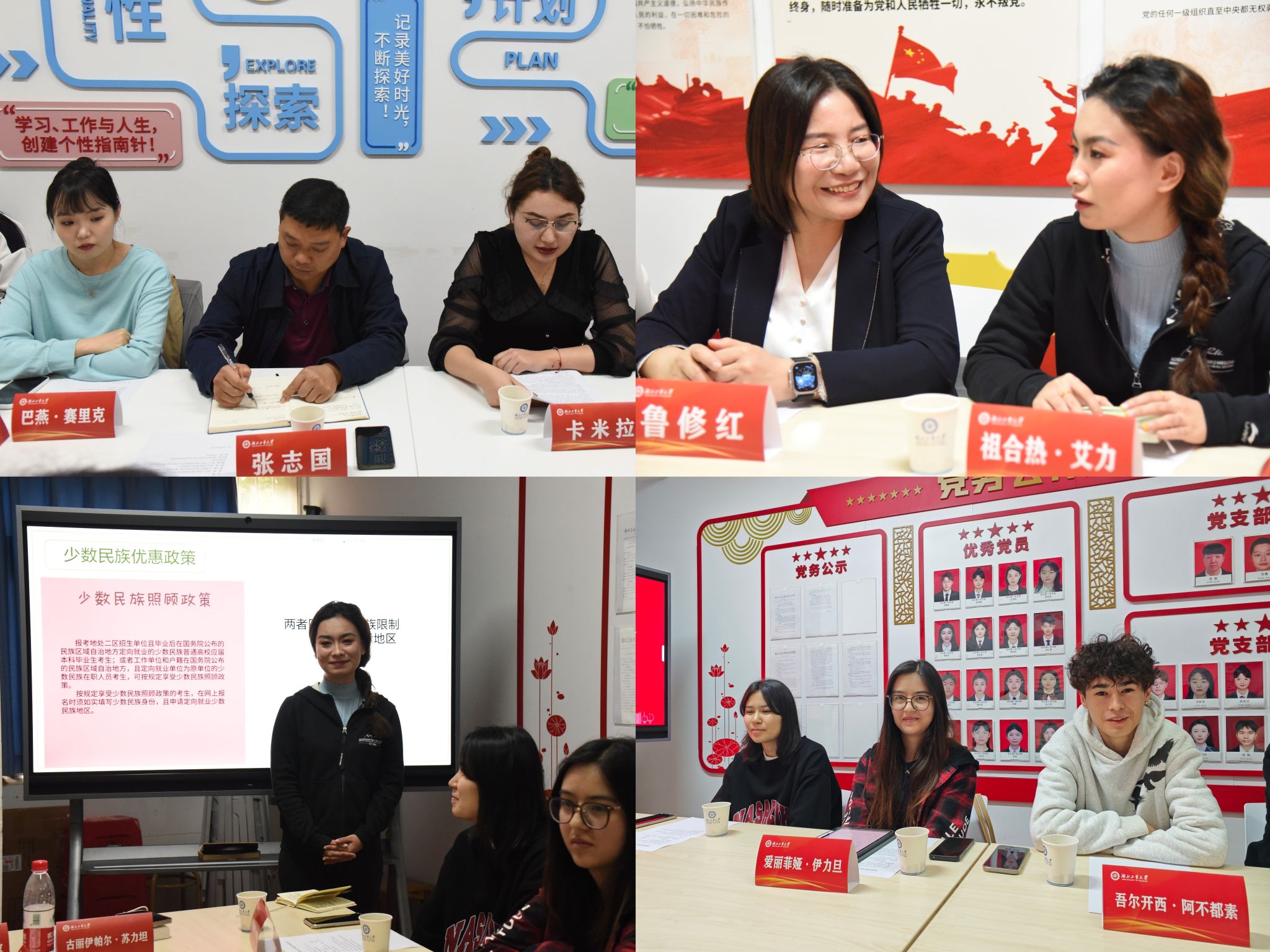 学生社区105党团活动室开展的考研深造专场,成功上岸新疆大学的2024届考研毕业生代表祖合热·艾力作了考研经验专题分享。祖合热是近三年唯一一位成功上岸“双一流”高校新疆大学的疆籍少数民族学生。分享中她从自身在大学期间参加的活动、竞赛、实践等方面分享了考研心路历程,并重点介绍了少数民族分数线、少数民族骨干计划、少数民族优惠政策及复试技巧。