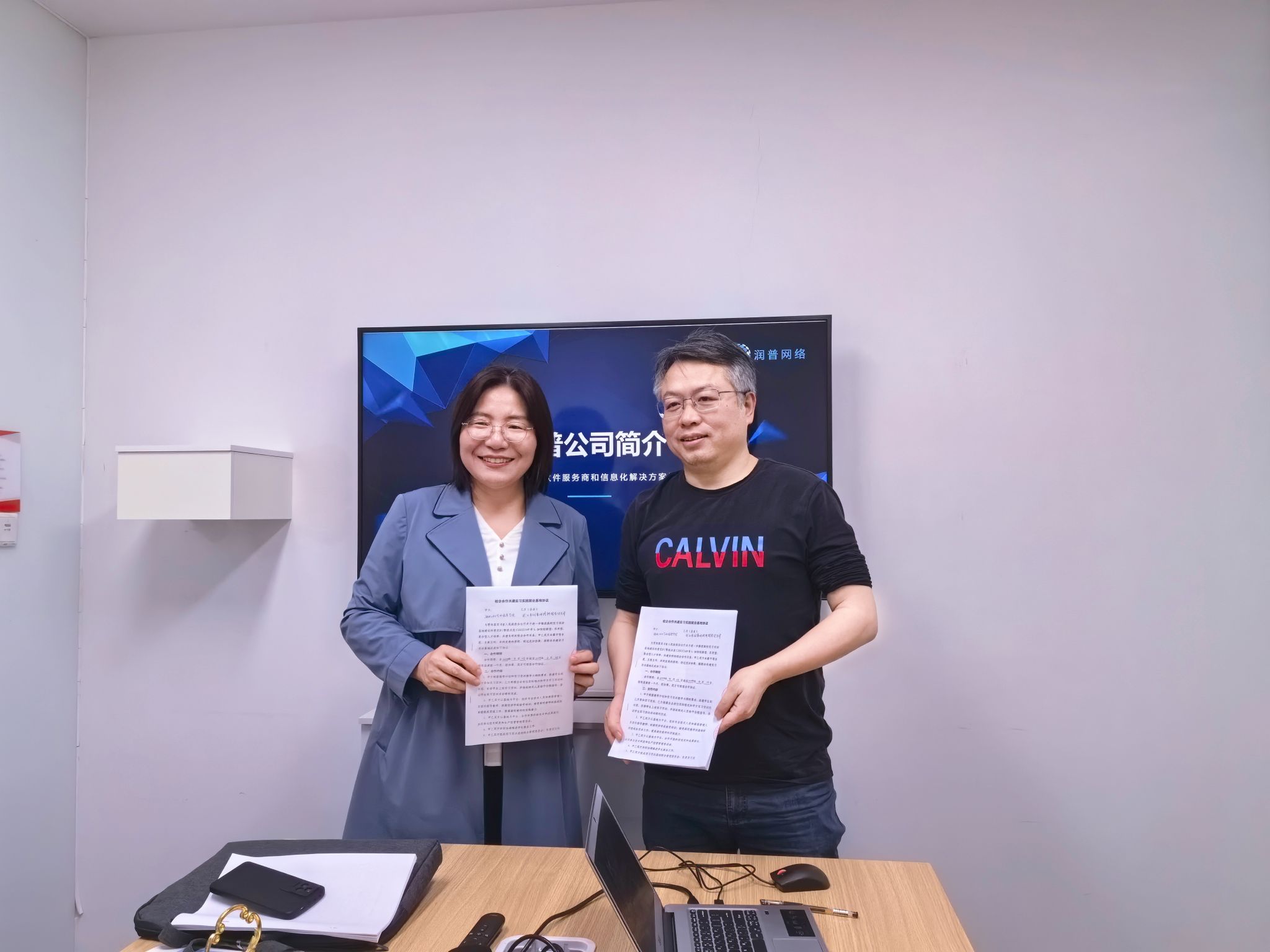 鲁修红和王俊峰代表双方续签了《校企合作共建实习实践就业基地协议》。语言文化传播系主任张剑平老师及学院学工办主任张薇老师参加了本次访企拓岗活动。