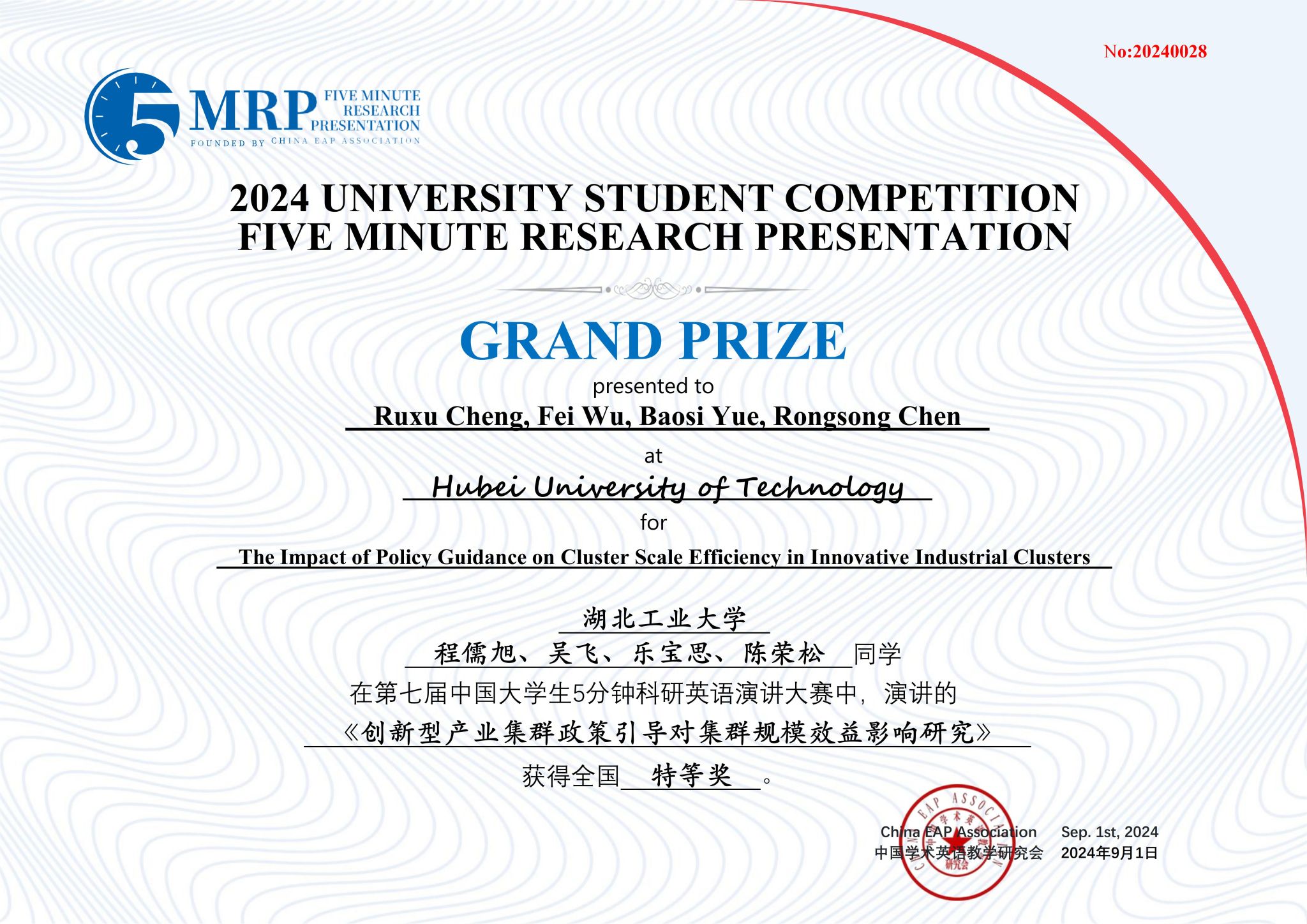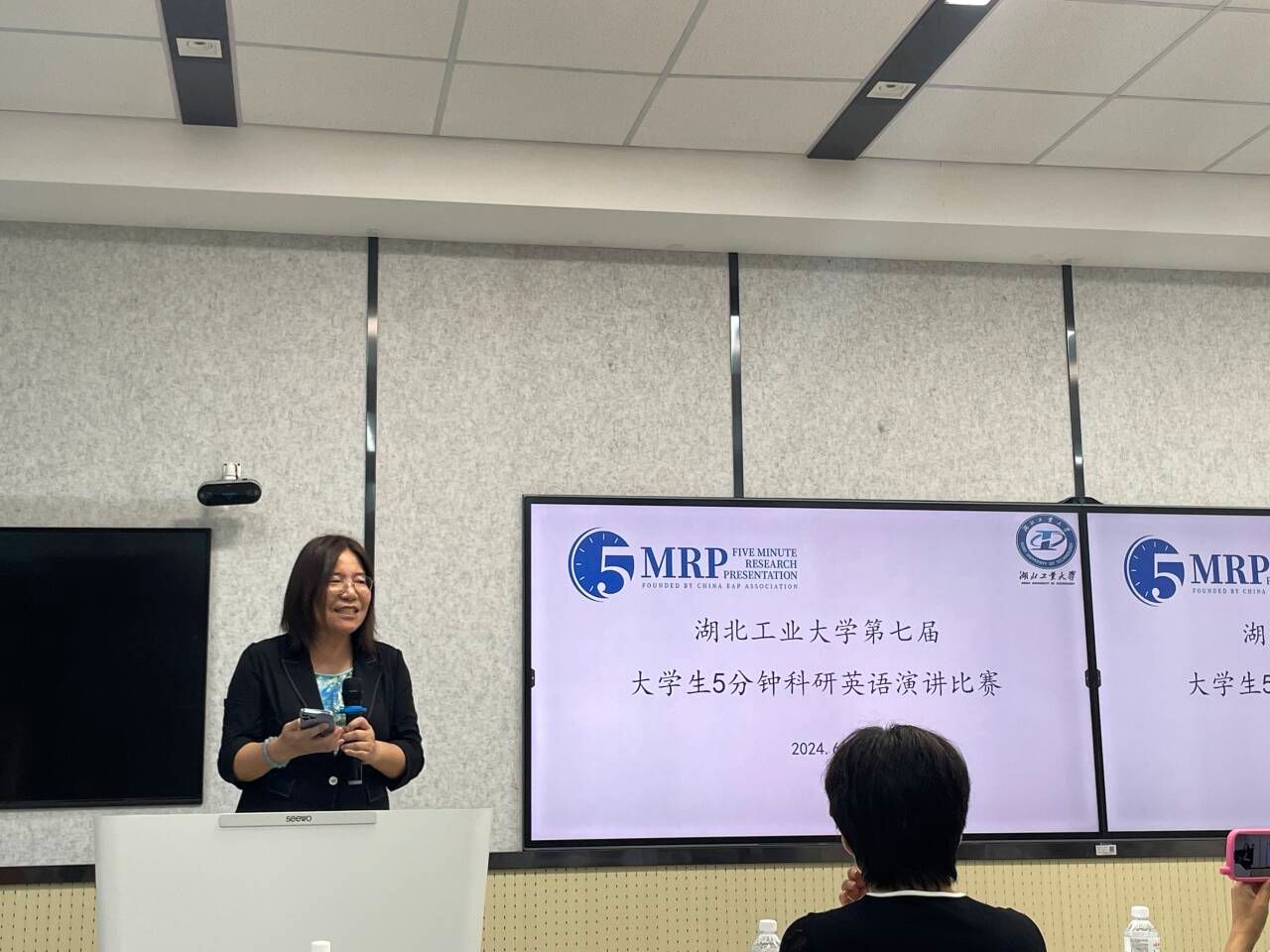 近日,在2024年第七届“中国大学生5分钟科研英语演讲大赛”(Five Minute Research Presentation, 5MRP)全国总决赛中,湖北工业大学研究生团队荣获全国特等奖1项、全国二等奖6项、全国三等奖7项、全国优胜奖8项,以及优秀指导教师奖和组织奖等奖项。展现了我校在科研英语演讲领域的雄厚实力。