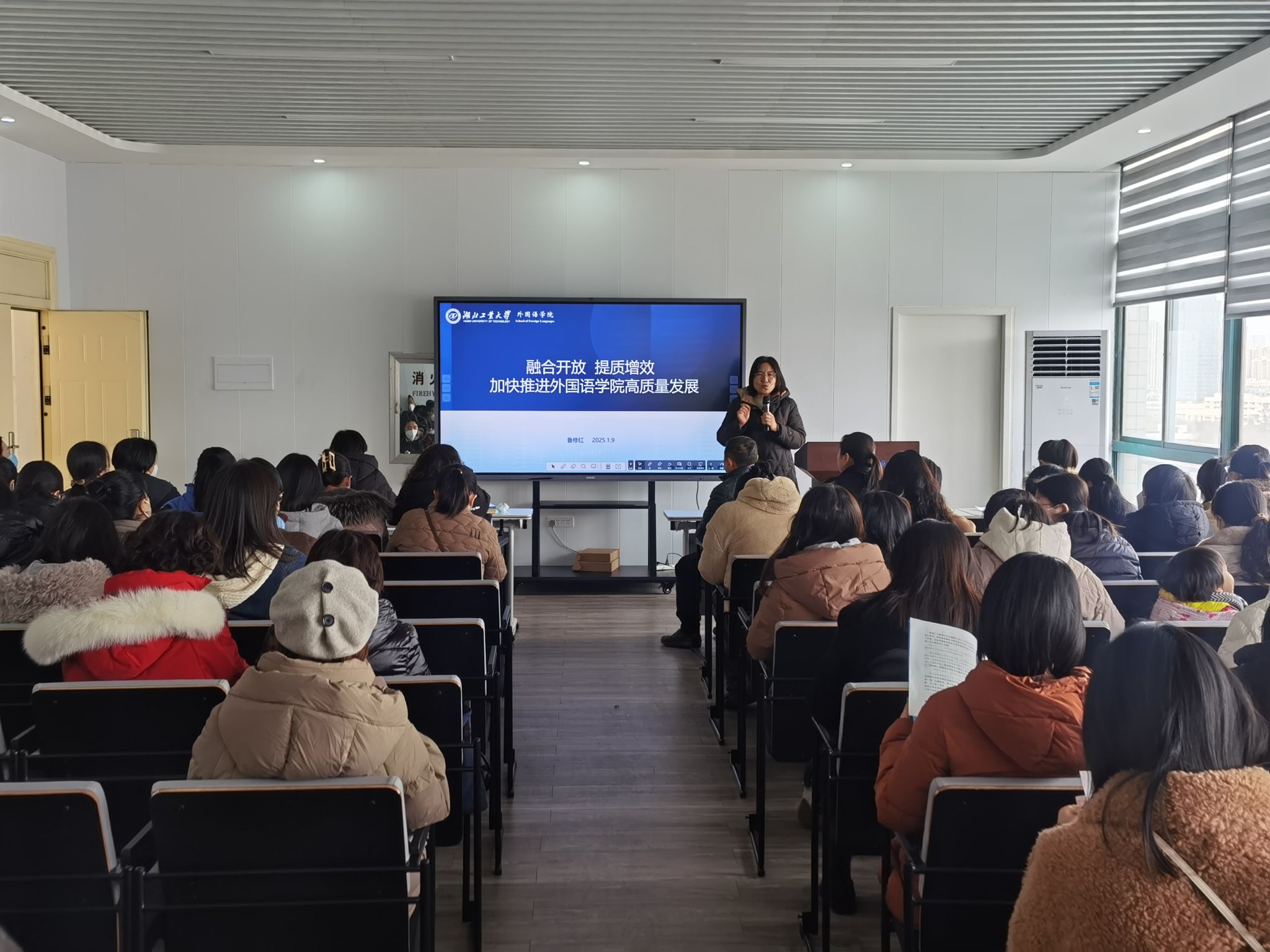 随后,学院党委书记张志国对2024年外院工会的工作进行了总结和回顾。在过去的一年里,学院工会在组织师生参加校运动会、学院师生运动会、校“教工杯”羽毛球赛及校合唱大赛等方面都取得了优异成绩,为丰富教职工的文化生活、增强团队凝聚力做出了积极贡献。他还对工会福利发放和工会慰问工作作了总结,并对年终考核和绩效发放的相关政策作了说明。