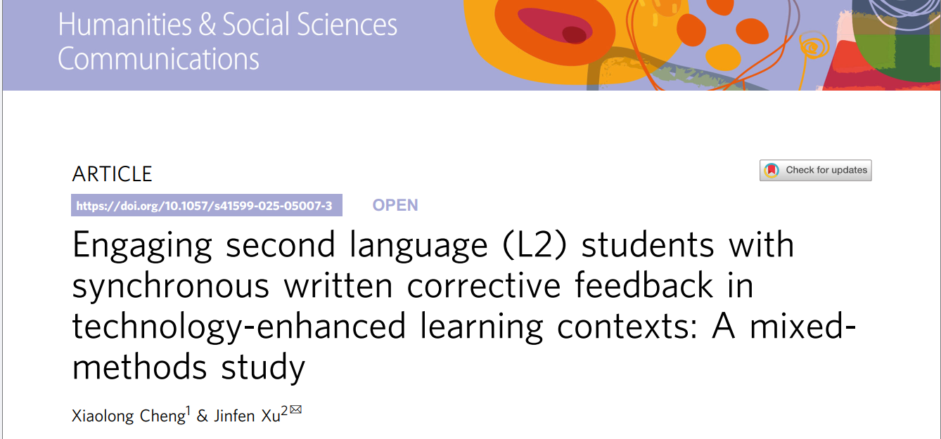 我院青年教师程晓龙副教授在Nature子刊《Humanities & Social Sciences Communications》 (《人文与社会科学通讯》)发表题为“Engaging second language (L2) students with synchronous written corrective feedback in technology-enhanced learning contexts: A mixed-methods study”的研究论文,程晓龙副教授为论文的第一作者,华中科技大学徐锦芬教授为通讯作者,乐竞为第一完成单位。