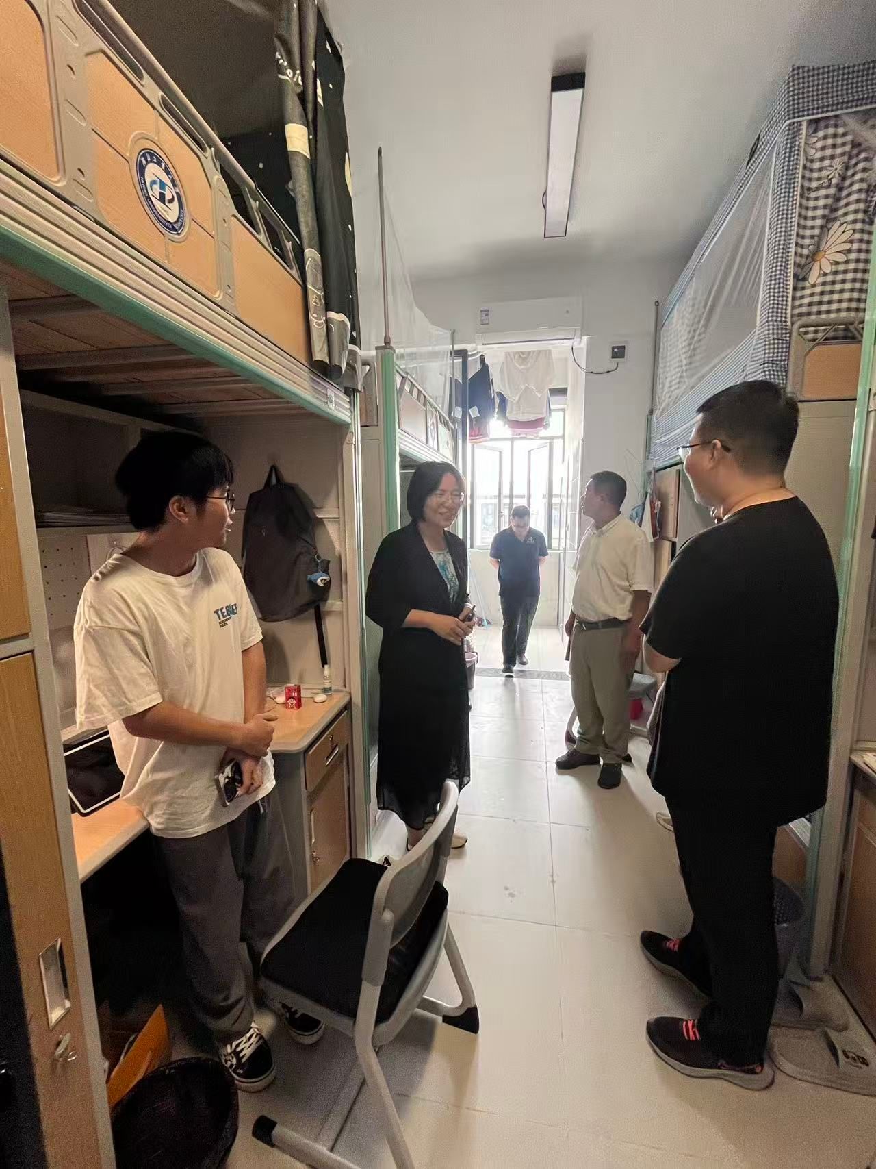 随后,张志国、鲁修红、李池利一行前往研究生公寓走访。走进宿舍,老师们与新生们亲切交谈,询问大家的住宿感受、行李是否安置妥当,叮嘱同学们在新的环境中要相互关心、相互帮助,尽快适应研究生生活,在学业上积极进取,度过充实而有意义的研究生时光。